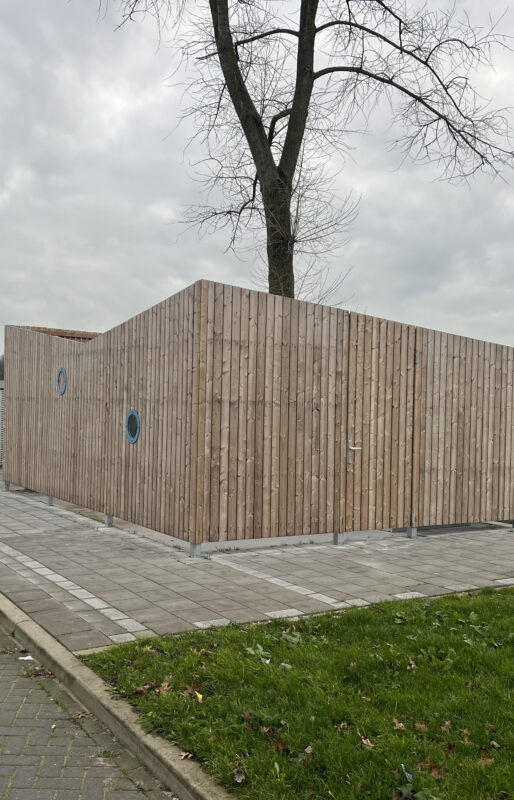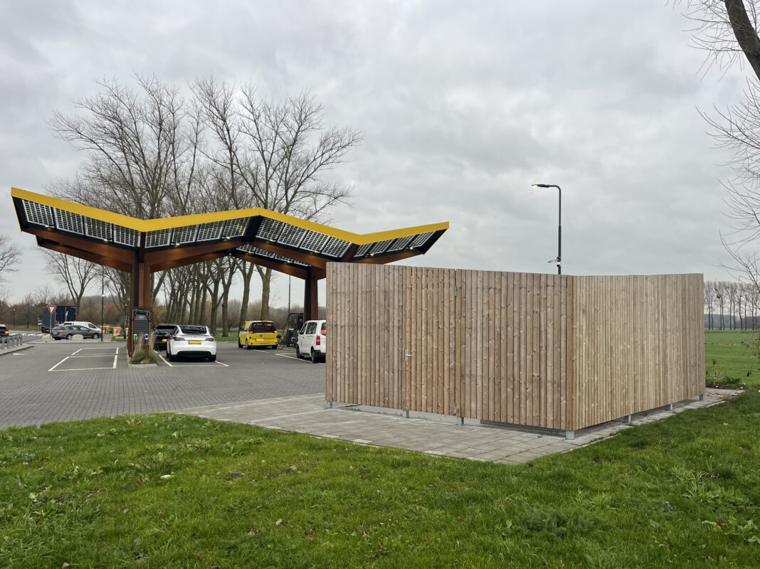 Binnen de afscheiding staan transformatorhuizen met batterijopslag. Overdag bewaren ze de overtollige energie die de zonnepanelen boven het Fastned-laadstation genereren. ’s Nachts en op drukke momenten wordt deze groene energie weer ingezet zodat laden op zonne-energie 24/7 mogelijk is.
