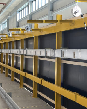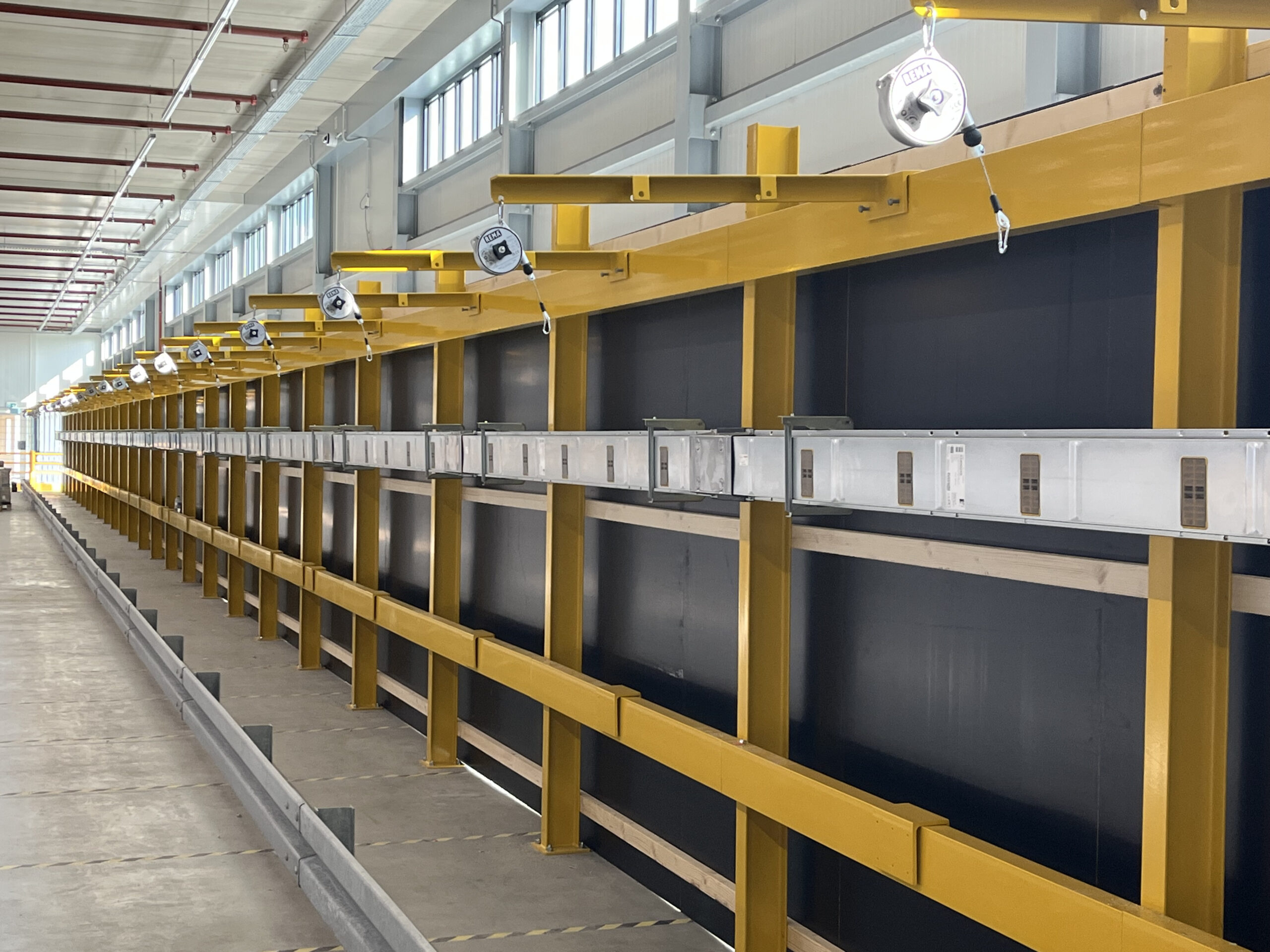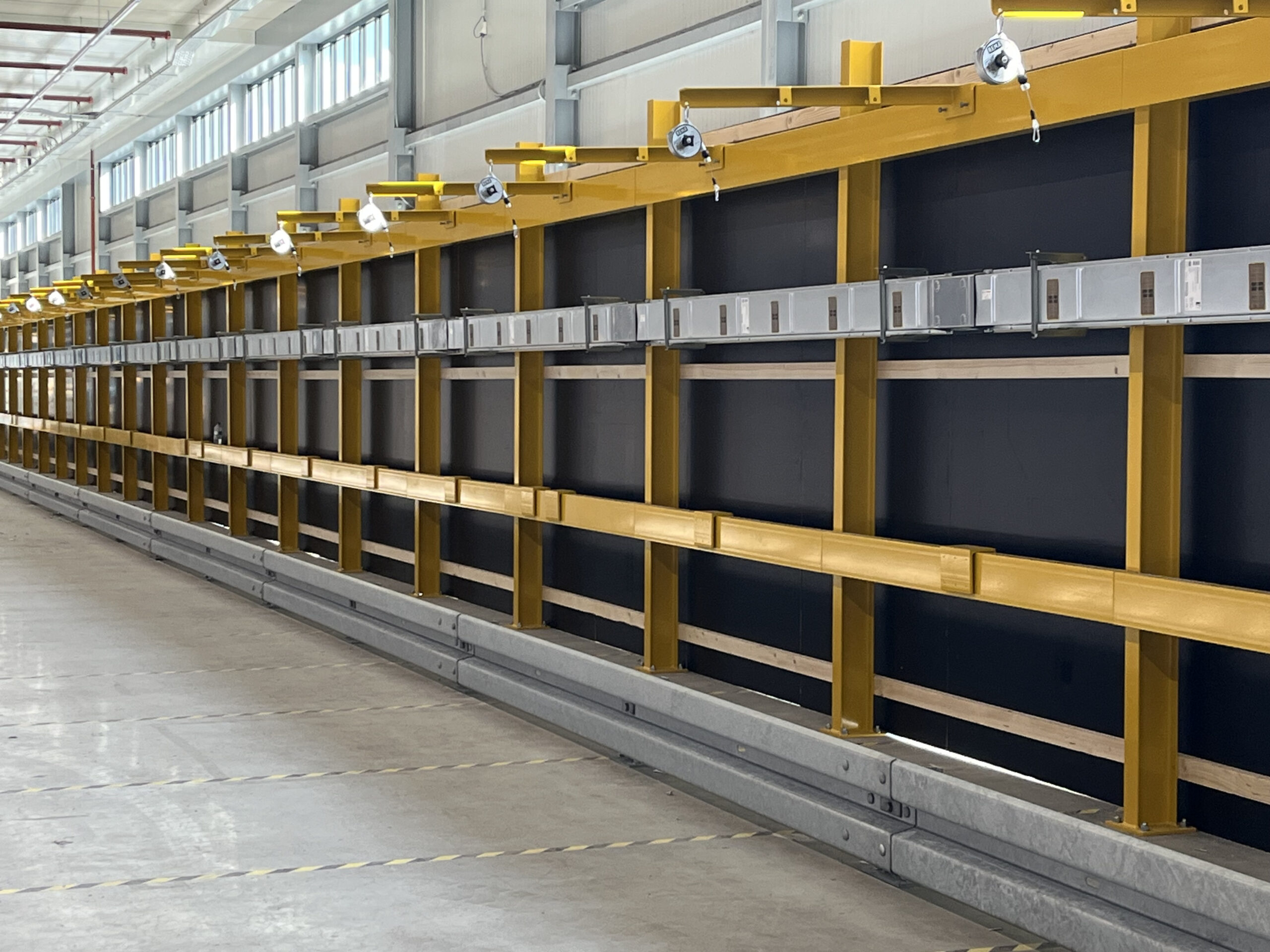 In het ene geval is een beschermende vangrailrand voldoende, in het andere geval verzorgen wij daarnaast een snoergeleidingssysteem met katrollen zodat de heftrucks op gepaste afstand van het station geladen kunnen worden. De gele hekwerken die op de foto’s te zien zijn zorgen voor een extra stuk bescherming.