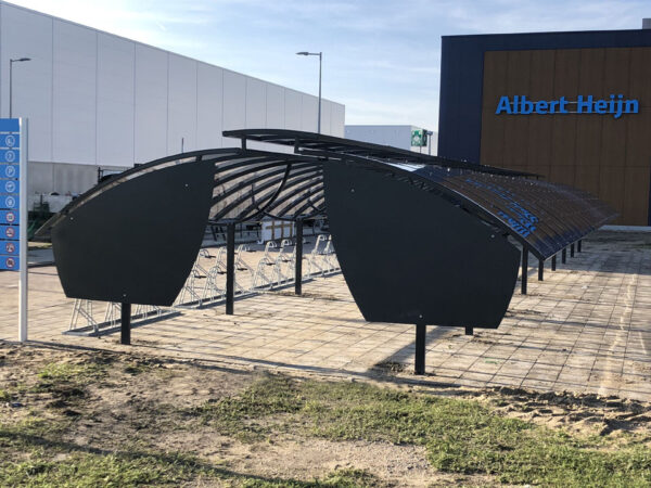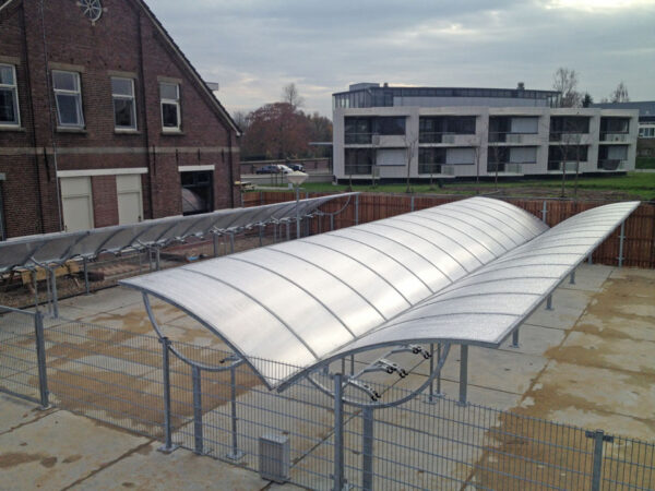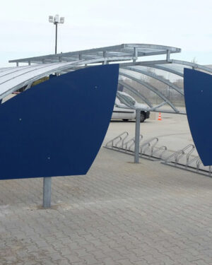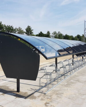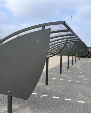De afgeronde vormen van de fietsenstalling V-500 geven deze fietsoverkapping een trendy en vrolijke uitstraling. De fietsenstalling V-500 is leverbaar met of zonder zijwand. De zijwand volgt de vorm van het dak en maakt zo een mooi geheel.