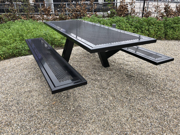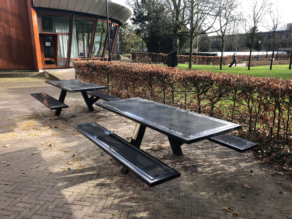 De zitting en het tafelblad bestaan uit geperforeerde staalplaat met daaromheen een stalen frame.